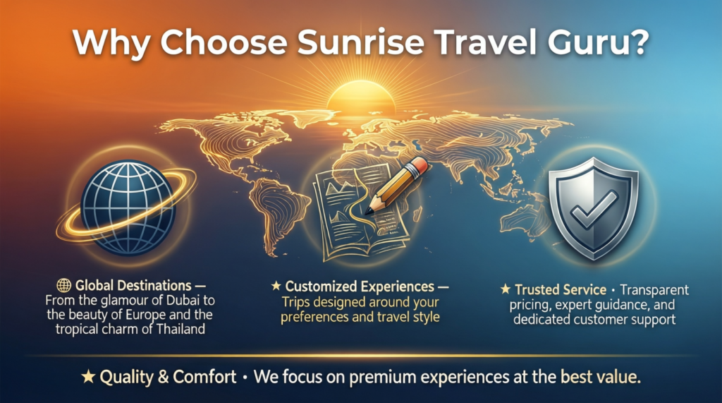At Sunrise Travel Guru, we believe travel is not just about visiting places—it’s about discovering cultures, creating stories, and experiencing life beyond borders. With years of industry expertise, we specialize in crafting premium travel experiences for destinations like Dubai, Thailand, Europe, and many more breathtaking locations worldwide.